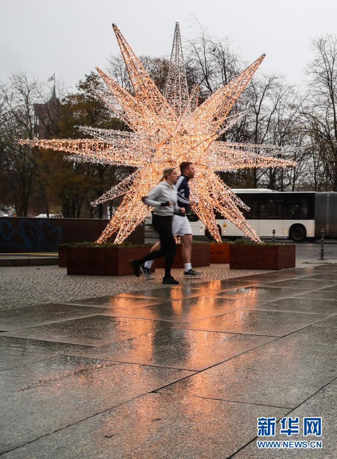 11月26日,在德国首都柏林,两名跑步者经过一处圣诞灯饰。