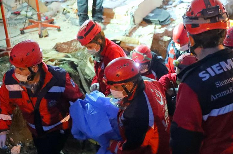10月31日,在土耳其伊兹密尔省,救援人员转移一名伤者。 跨土耳其西部海岸的爱琴海海域10月30日发生6.6级地震。截至31日上午,地震已致土耳其25人死亡。