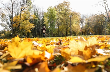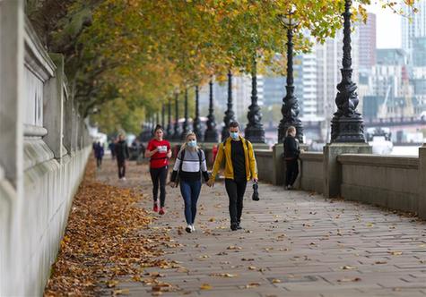 这是10月28日在德国首都柏林一座公园内拍摄的两名行人。