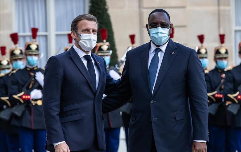 11月12日,法国总统马克龙(左)在巴黎总统府爱丽舍宫迎接前来参加巴黎和平论坛的欧洲理事会主席米歇尔。 第三届巴黎和平论坛11日至13日在法国巴黎举行。