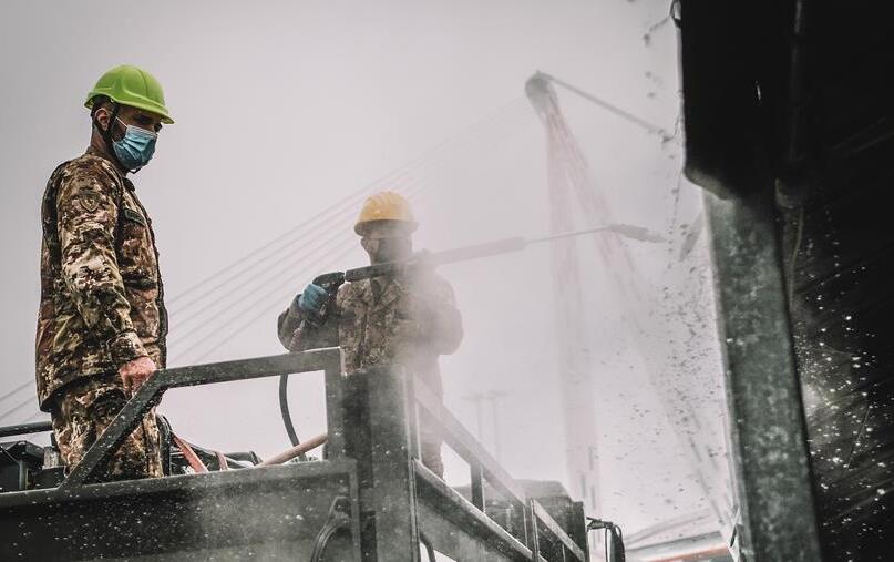 11月12日,意大利陆军士兵在都灵搭建新冠快速检测点。 意大利陆军正在都灵的尤文图斯安联体育场外搭建一处新冠快速检测点,计划实现每日约1000次的免下车检测,将最早于13日投入使用。