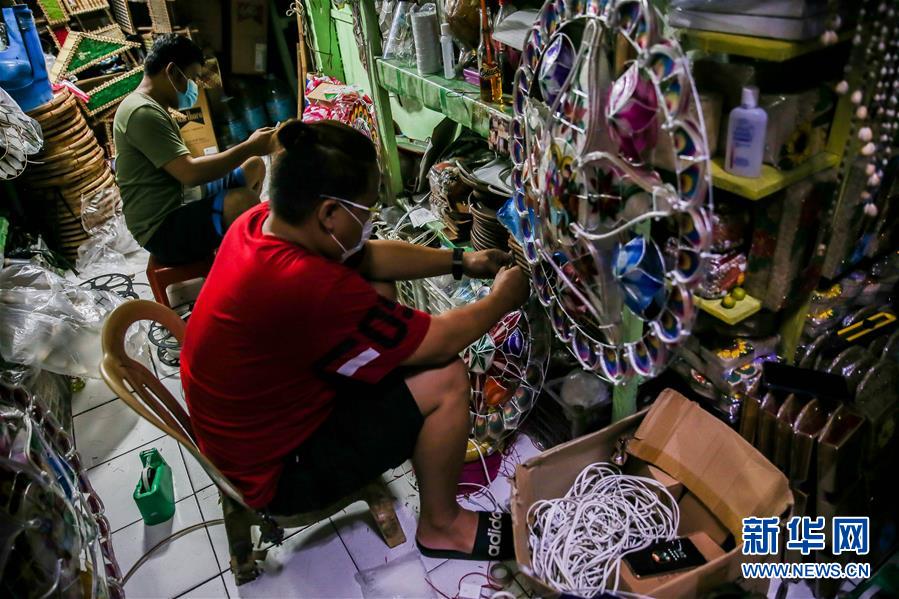 8月29日,在菲律宾首都马尼拉的手工艺品摊位上,手工业者佩戴口罩编制手工艺制品。 菲律宾累计新冠确诊病例已经超过21万例。 新华社发(乌马利摄)