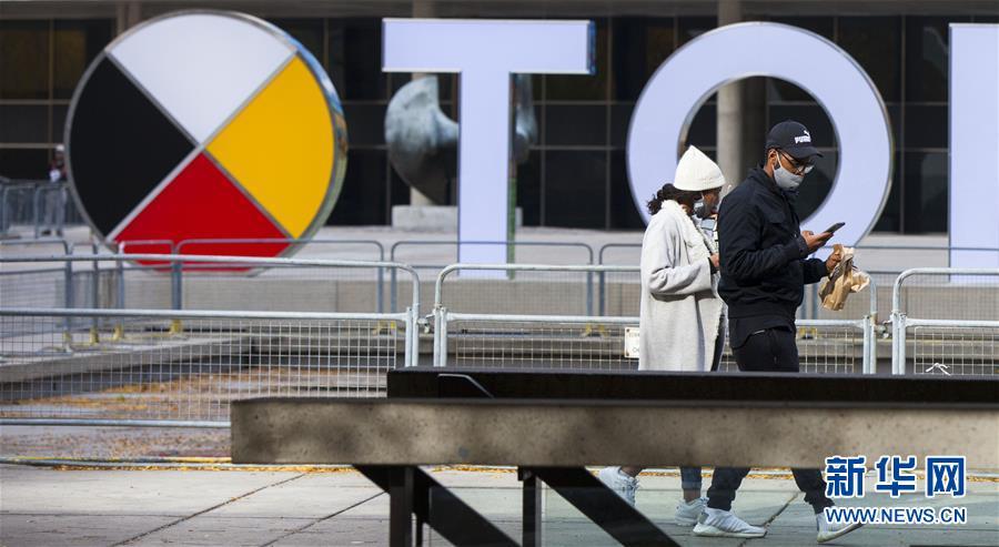 11月5日,在加拿大多伦多,戴口罩的行人经过多伦多城市标志牌。 截至当日下午,加拿大累计新冠确诊病例上升至250913例,累计死亡病例10381例。 新华社发(邹峥摄)