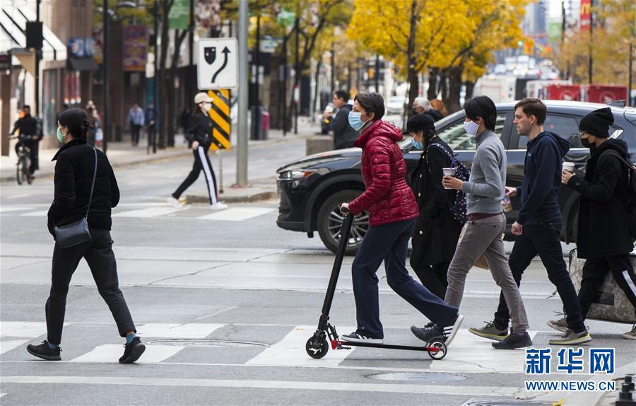 11月5日,在加拿大多伦多,一名戴口罩的行人骑着滑板车过马路。 截至当日下午,加拿大累计新冠确诊病例上升至250913例,累计死亡病例10381例。 新华社发(邹峥摄)