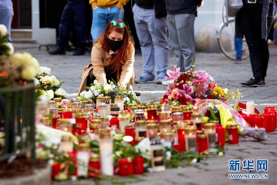 11月5日,一名女子在奥地利维也纳悼念遇难者。 奥地利首都维也纳11月2日晚发生枪击事件。奥总理库尔茨谴责这起事件是“卑劣的恐怖袭击”。 新华社发(乔治斯·施耐德 摄)