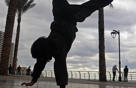 11月5日,在黎巴嫩贝鲁特,一名儿童在乌云密布的天空下玩耍。