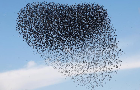 近日,以色列南部拉哈特市附近的一个废弃设施上空大批椋鸟来回飞行,拼出各种图案。