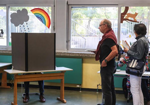 10月14日,在德国纽伦堡,两名选民在一处投票站等待填写选票。 当日,德国南部巴伐利亚州议会选举开始投票。
