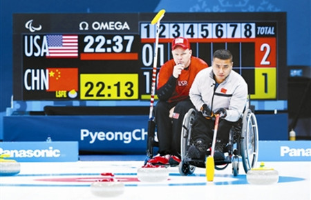 3月13日,2018平昌冬残奥会轮椅冰壶循环赛在江陵冰壶中心举行,中国队以6比4战胜美国队。