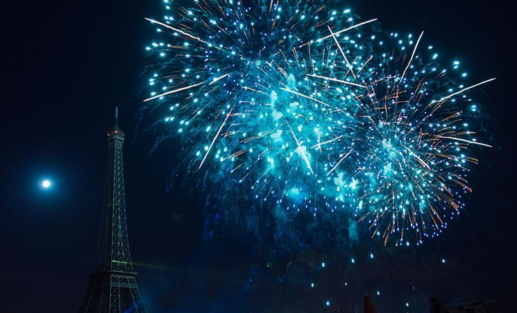7月14日,在法国巴黎,庆祝国庆日的烟花在埃菲尔铁塔附近绽放。