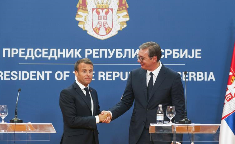7月15日,在塞尔维亚首都贝尔格莱德,塞尔维亚总统武契奇(右)与来访的法国总统马克龙出席新闻发布会。