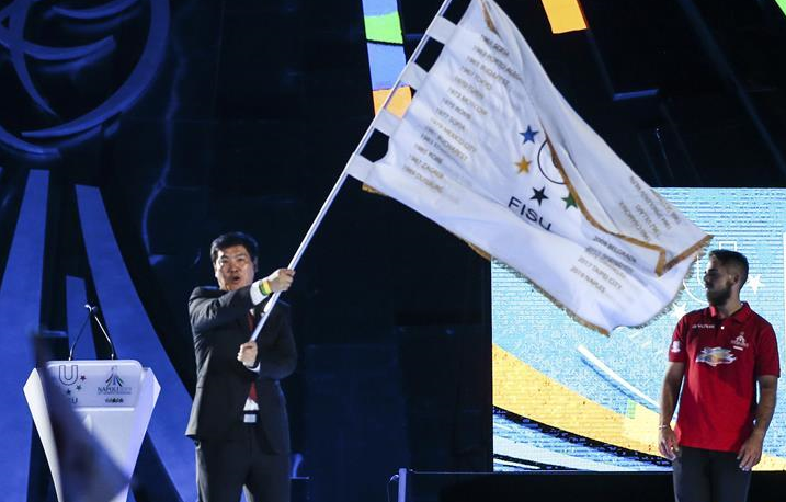 7月14日,下届世界大学生夏季运动会举办城市、成都市市长罗强在闭幕式上挥舞国际大学生体育联合会会旗。