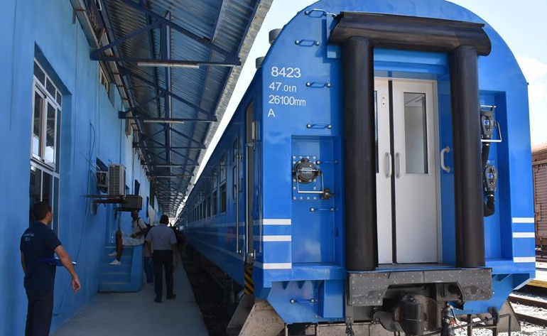 7月13日,一列由中国设计并生产的铁路客车组成的列车停靠在古巴哈瓦那中央火车站。