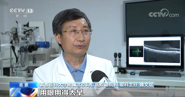 首都医科大学附属北京同仁医院副院长 眼科主任 魏文斌:用眼用得太早、太狠。有的把iPad当保姆,小孩哭的时候就把iPad往那一放,他就会不哭了,安静了。过早用电子产品、过早用眼,是近视低龄化一个主要的原因。在幼儿园之前、婴幼儿的时候应该远离电子产品,我们就不应该让他用。那么到了幼儿园或者是小学的时候,我们也是要严格去控制时间,要遵循看20分钟,尤其是特别小的孩子,15分钟就应该休息了,一天不能超过两次。家长表率作用要充分发挥,比如说在家里家长盯着电视机盯着手机在玩,你跟孩子说你别玩了,那表率就没有,所以这个表率作用非常重要。