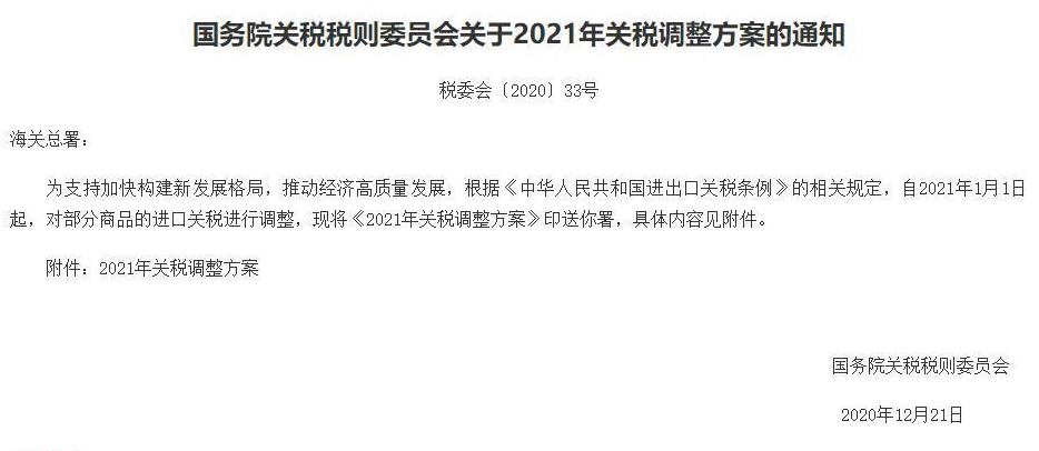 为贯彻落实党的十九届五中全会精神,坚持新发展理念,支持构建以国内大循环为主体、国内国际双循环相互促进的新发展格局,经国务院批准,国务院关税税则委员会近日印发通知,2021年将调整部分进口商品的最惠国税率、协定税率和暂定税率。