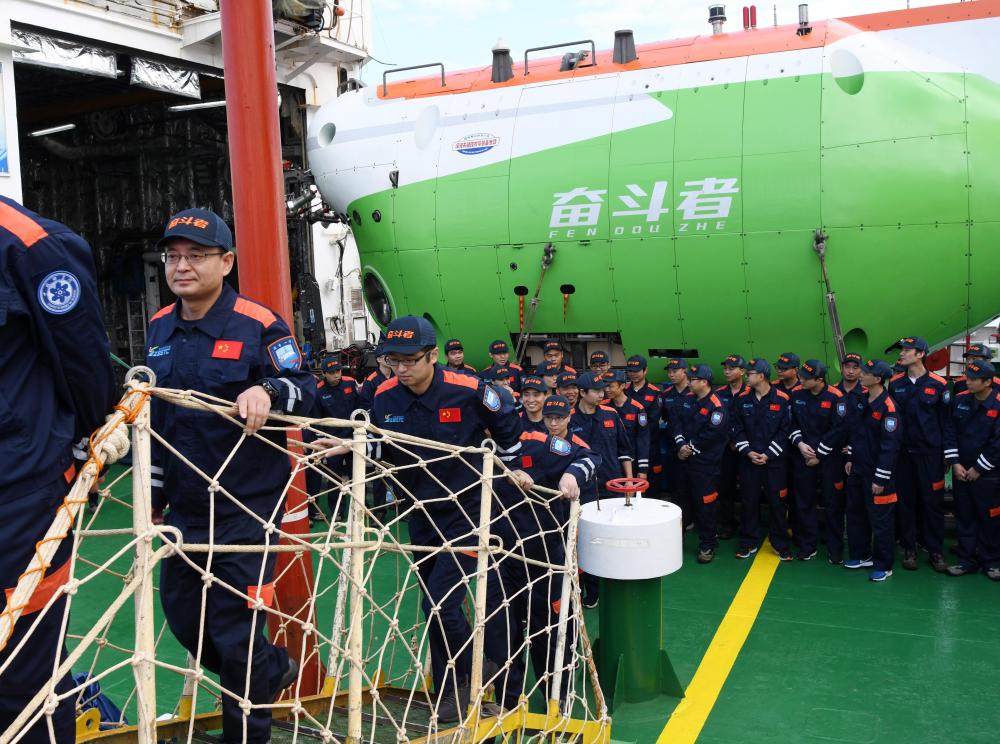 11月28日,在海南省三亚市南山港,在马里亚纳海沟成功实现10909米坐底纪录的“奋斗者”号载人潜水器随“探索一号”科考船胜利返航。 新华社记者 陈凯姿 摄
