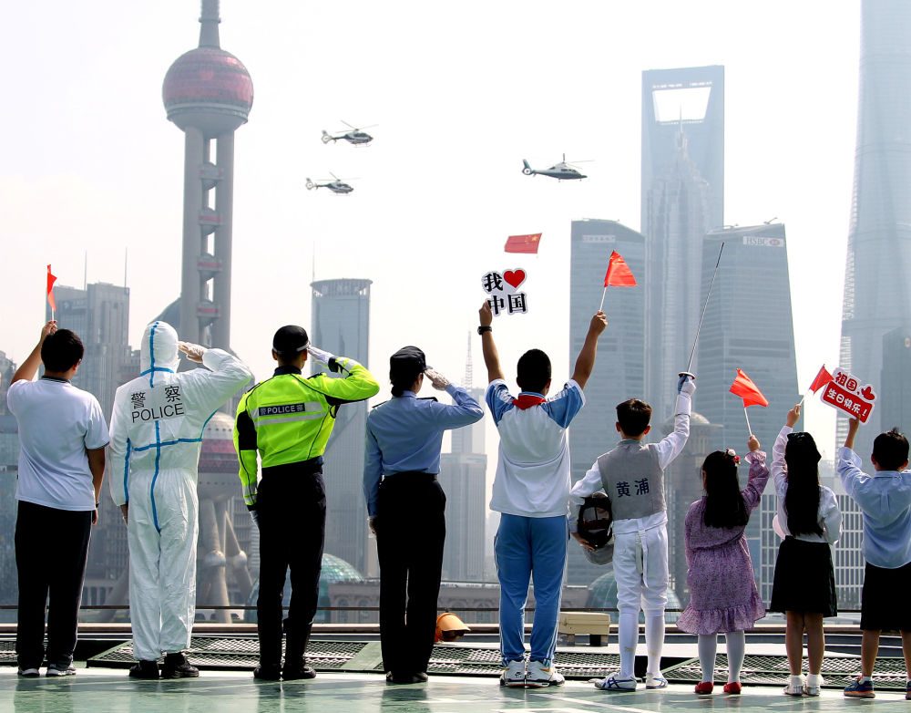 10月1日,警用直升机悬挂着五星红旗飞过上海黄浦江上空。新华社记者 陈飞 摄