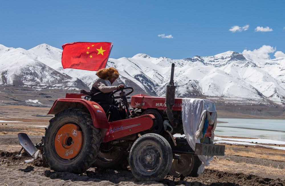 4月30日,拖拉机在西藏那曲市尼玛县当穹错旁举行的春耕典礼上行进。新华社记者 侯捷 摄