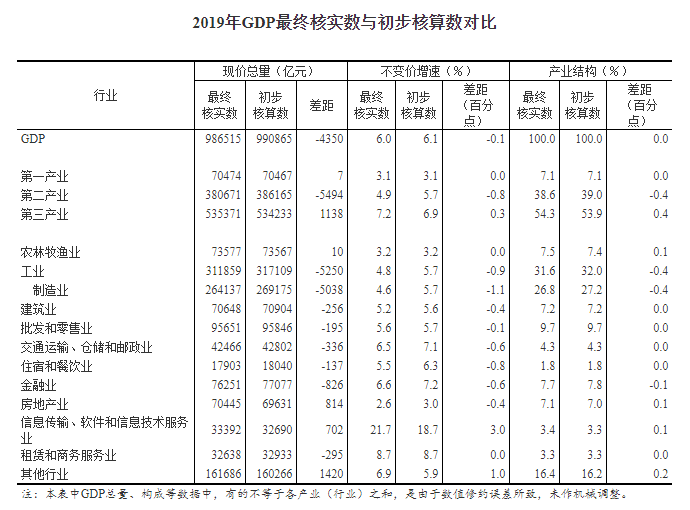 经最终核实,2019年,GDP现价总量为986515亿元,比初步核算数减少了4350亿元;按不变价格计算,比上年增长6.0%,比初步核算数下降0.1个百分点。三次产业和各行业数据见附表。