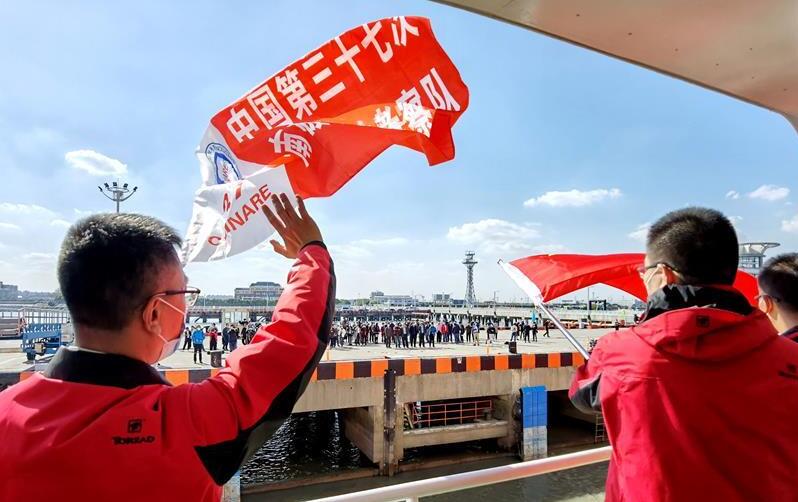 11月10日,南极科学考察队队员在“雪龙2”号上同送行人员告别。 当日,由自然资源部组织的中国第37次南极科学考察队乘坐“雪龙2”号极地科考破冰船从上海起航,奔赴南极执行科学考察任务。