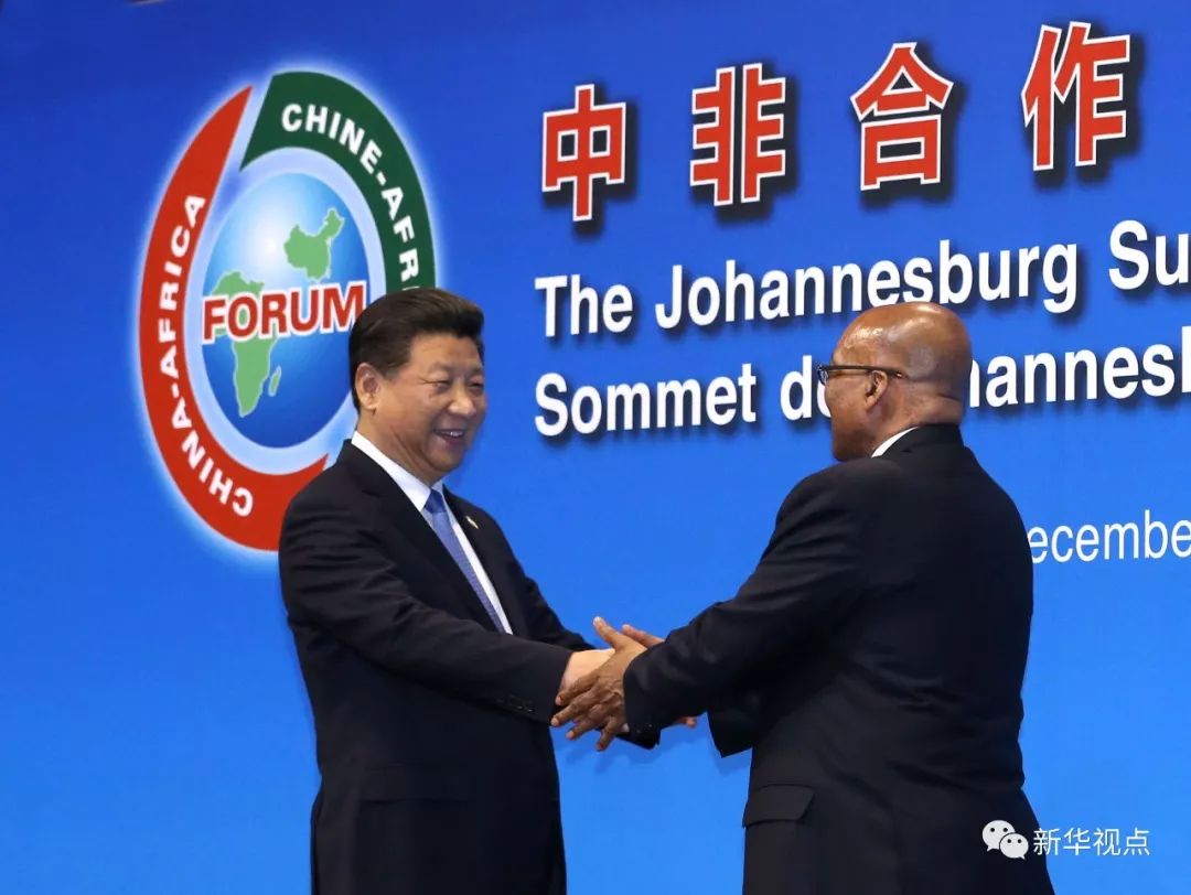 2015年12月4日,国家主席习近平出席中非合作论坛约翰内斯堡峰会开幕式并发表致辞。这是南非总统祖马迎接习近平。新华社记者庞兴雷摄