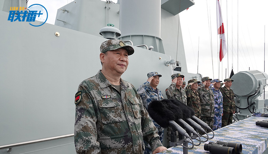 伴随着激昂的分列式进行曲,受阅舰艇劈波斩浪气势磅礴,空中梯队驰骋翱翔直插云霄。在习近平的检阅下,训练部队带着党和人民的重托,迅疾开往训练海域,一场跨区域实兵演练在海上全面展开。