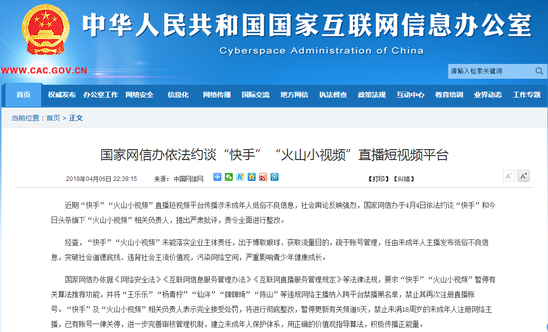 国家网信办依法约谈“快手”“火山小视频”直播短视频平台。网页截图