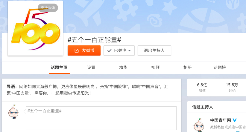 新浪微博话题#五个一百正能量#阅读量突破6.8亿。网络截图