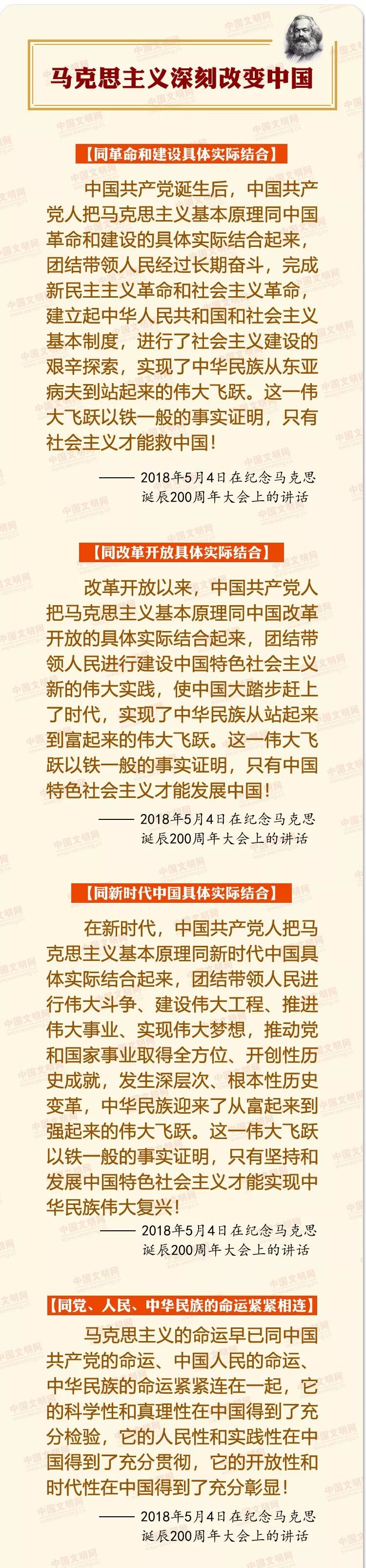 编者按:马克思是全世界无产阶级和劳动人民的革命导师,是马克思主义的主要创始人,是马克思主义政党的缔造者和国际共产主义的开创者,是近代以来最伟大的思想家。中国共产党是用马克思主义武装起来的政党,马克思主义是我们共产党人理想信念的灵魂。习近平总书记在纪念马克思诞辰200周年大会上强调,新时代,中国共产党人仍然要学习马克思,学习和实践马克思主义,高扬马克思主义伟大旗帜,不断从中汲取科学智慧和理论力量,更有定力、更有自信、更有智慧地坚持和发展新时代中国特色社会主义,让马克思、恩格斯设想的人类社会美好前景不断在中国大地上生动展现出来。即日起,中国文明网推出《好好学习·习近平谈马克思》系列摘编,精选部分重要论述,与广大网友一起学习,共同领略马克思主义伟大的真理力量。今天推出第三期《马克思主义深刻改变中国》。