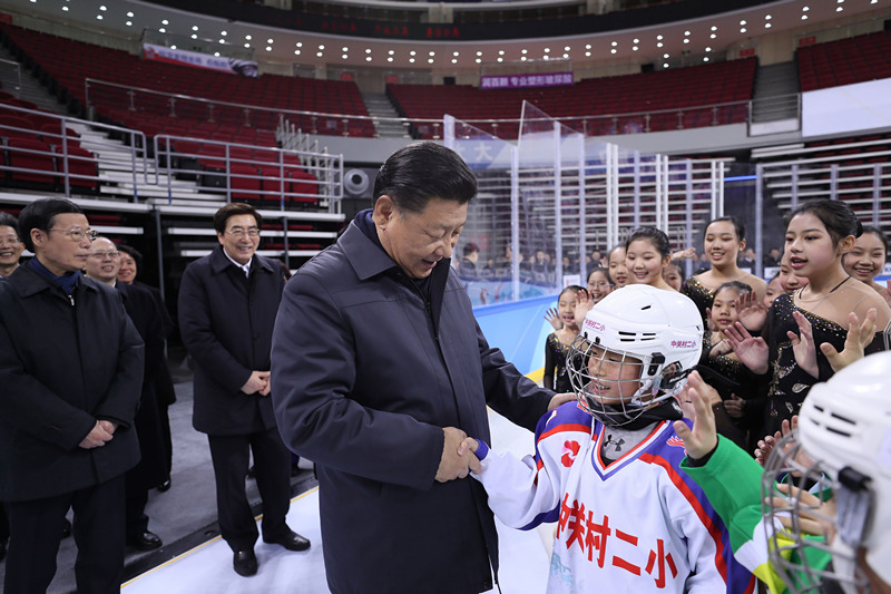 2017年2月24日上午,在五棵松体育中心,习近平实地察看2022年北京冬奥会冰球比赛场馆,和小冰球队员握手。