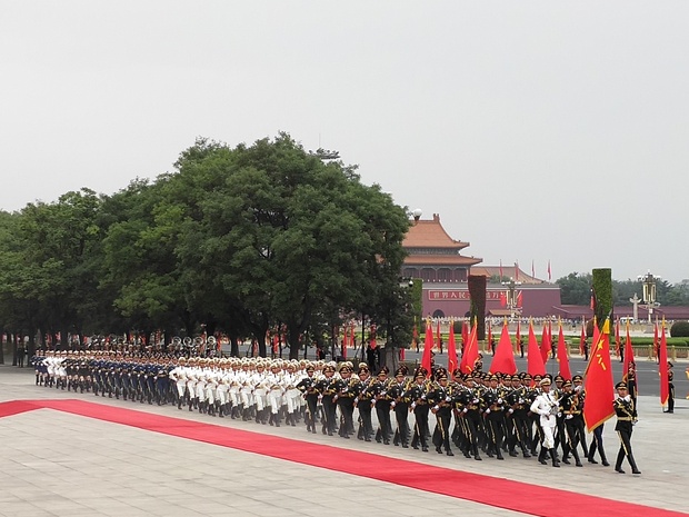 人民大会堂东门外广场,是中国举行国事访问欢迎仪式的主要场所。而今天的这场欢迎仪式有了一些和以往不同的地方——中方重新调整了来宾车队的抵达路线,车队特意经过了天安门广场这一重要地标,以展现北京的古都魅力和新气象;车队在进入天安门广场区域后,沿途增设了手持红旗的仪仗兵,以增加仪式的欢迎氛围;仪仗队中也单独增加了女兵方队,以更好展现女兵巾帼不让须眉的飒爽英姿......