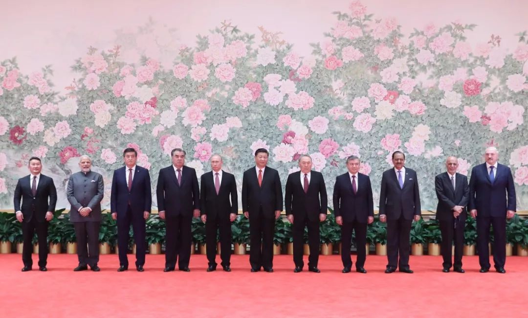 6月9日,国家主席习近平在青岛国际会议中心举行宴会,欢迎出席上海合作组织青岛峰会的外方领导人。这是习近平同外方领导人在巨幅工笔画《花开盛世》前合影留念。新华社记者 丁林 摄