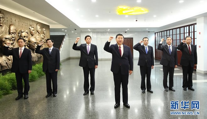 “上海党的一大会址、嘉兴南湖红船是我们党梦想起航的地方。”2017年10月31日,党的十九大闭幕仅一周,习近平就带领新一届中央政治局常委专程从北京前往上海和浙江嘉兴,瞻仰上海中共一大会址和浙江嘉兴南湖红船,回顾建党历史,重温入党誓词,宣示新一届党中央领导集体的坚定政治信念:“牢记共产主义远大理想,坚定中国特色社会主义共同理想,一步一个脚印向着美好未来和最高理想前进。”