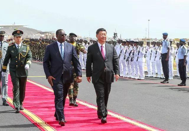 塞内加尔总统萨勒在机场为习近平主席举行隆重欢迎仪式。(新华社记者谢环驰摄)