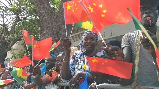 塞内加尔当地民众挥舞中塞两国国旗,热情欢呼。(新华社记者燕雁摄)