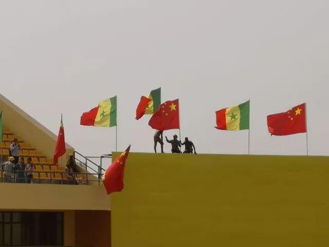 位于达喀尔近郊的塞内加尔竞技摔跤场,工作人员布置国旗,迎接习近平主席到来。(新华社记者廖宇杰摄)
