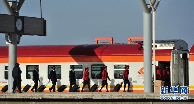 2017年6月9日,在肯尼亚蒙内铁路内罗毕南站,乘务员登上列车。蒙内铁路全长约480公里,2017年5月31日正式通车,6月1日开始客运服务。每天运行一对往返蒙巴萨与内罗毕的列车。图片来源:新华社