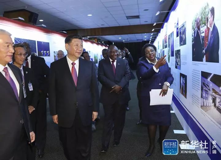 7月24日下午,南非科学和工业研究理事会国际会议中心展览厅。习近平主席同拉马福萨总统一起参观中南科技创新合作成果图片展。