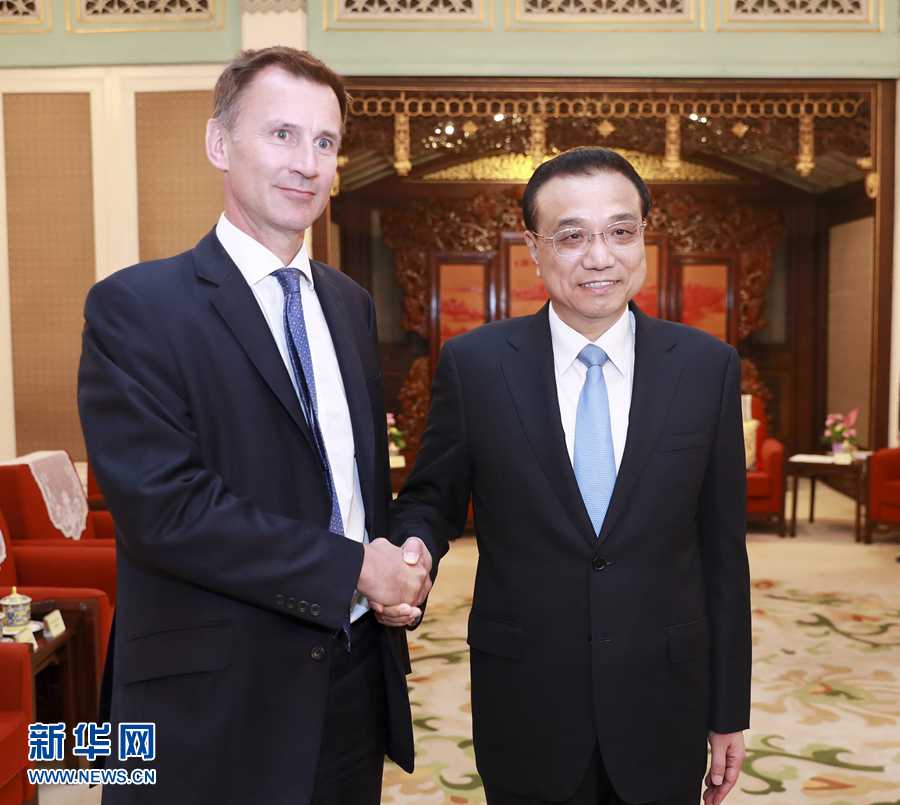 7月30日,国务院总理李克强在北京中南海紫光阁会见来华出席第九次中英战略对话的英国外交大臣亨特。 新华社记者丁海涛摄