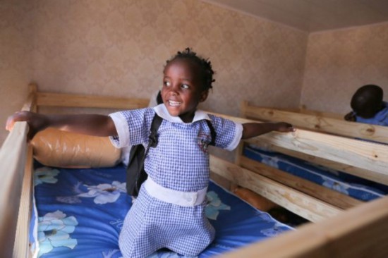 2016年8月12日,一名津巴布韦儿童在“非爱不可”爱心妈妈团捐建的孤儿院内感受新的双层木板床。新华社记者 许林贵摄