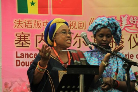 2013年12月11日,《媳妇的美好时代》法语版首播仪式在塞内加尔国家大剧院举行,图为配音演员在介绍自己在电视剧《媳妇的美好时代》中的角色。 新华社记者 邰剑秋摄