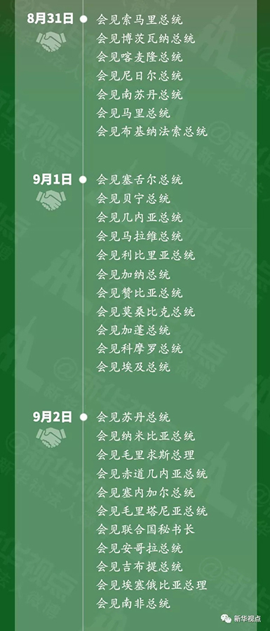 这是习近平主席在8月31日、9月1日、9月2日分别与来参加2018年中非合作论坛北京峰会的外宾进行会晤的场次。