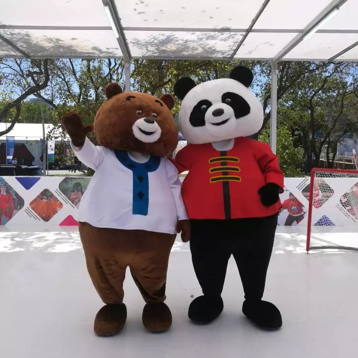 第四届东方经济论坛配套展示项目远东风采街上,可爱的“中国熊猫”和“俄罗斯棕熊”一起打冰球(新华社记者蒋国鹏摄)
