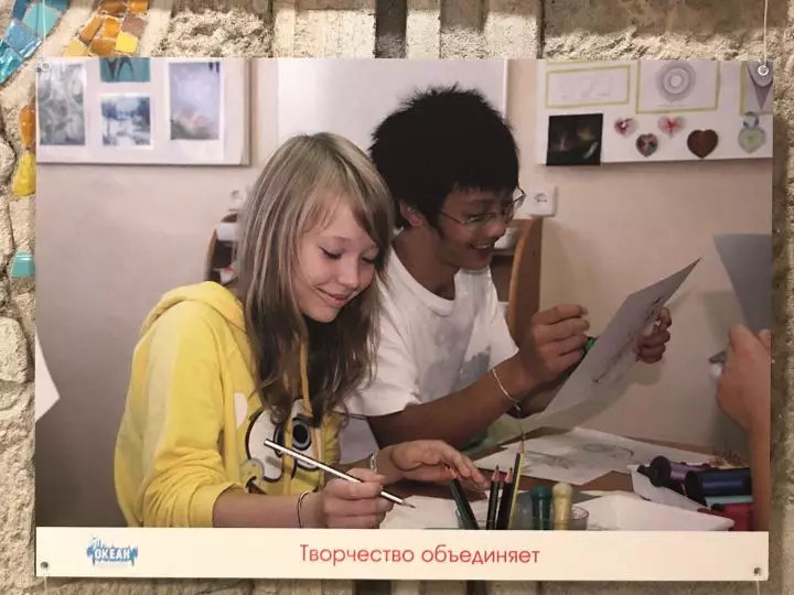 “海洋”全俄儿童中心展示的中国孩子和俄罗斯孩子一起上课的照片(新华社记者孟娜摄)