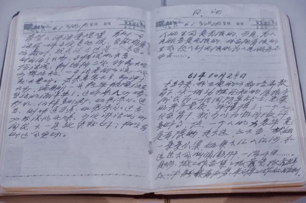 △最有名的一段雷锋日记:“人的生命是有限的,可是为人民服务是无限的。我要把有限的生命,投入到无限的为人民服务中去”。(央视记者拍摄)