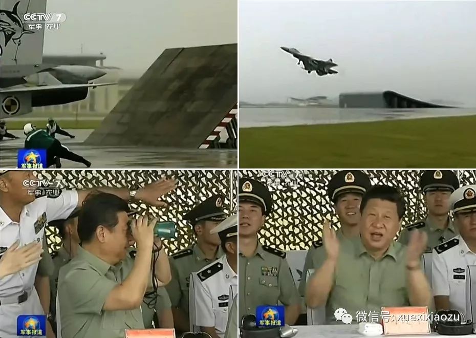28日,习主席冒雨视察海军舰载机综合试验训练基地,观看歼15舰载机滑跃起飞与阻拦着陆训练。看到参加训练的飞行员驾歼15在复杂气象条件下干净利落完成起降动作时,习主席高度赞扬飞行员技术过硬,并为舰载机飞行员鼓掌叫好!