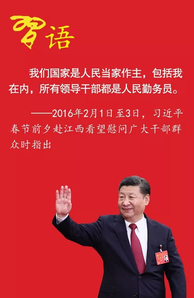 2016年2月1日至3日,习近平春节前夕赴江西看望慰问广大干部群众。2月2日,习近平乘车来到井冈山市茅坪乡神山村。这是一个贫困村。在贫困户张成德家中,习近平一间一间屋子察看,坐下来同夫妇俩算收入支出账,问家里种了什么、养了什么,吃穿住行还有什么困难和需求。老乡端上热气腾腾的米果请总书记品尝。女主人说,总书记给全国人民当家当得好,老百姓感到很幸福。习近平回应她说,我们国家是人民当家作主,包括我在内,所有领导干部都是人民勤务员。