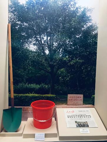 △这是习近平2012年12月8日在莲花山植树时用的铁锹和水桶。(广东改革开放40周年展览展品)