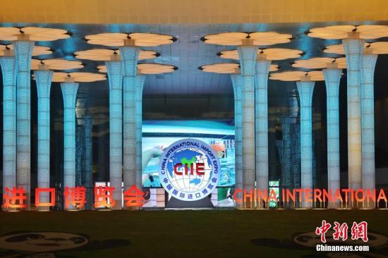 国家会展中心(上海)中央台阶上的24根立柱分别以红、蓝、黄、绿四组灯光交替变幻,展现“进博会”主体LOGO,整体效果简洁大气。中新社记者 张亨伟 摄