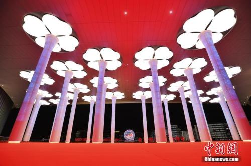 11月4日晚,首届中国国际进口博览会最后倒计时。当晚,主场馆国家会展中心(上海)点亮主题灯光,璀璨夺目。 张亨伟 摄